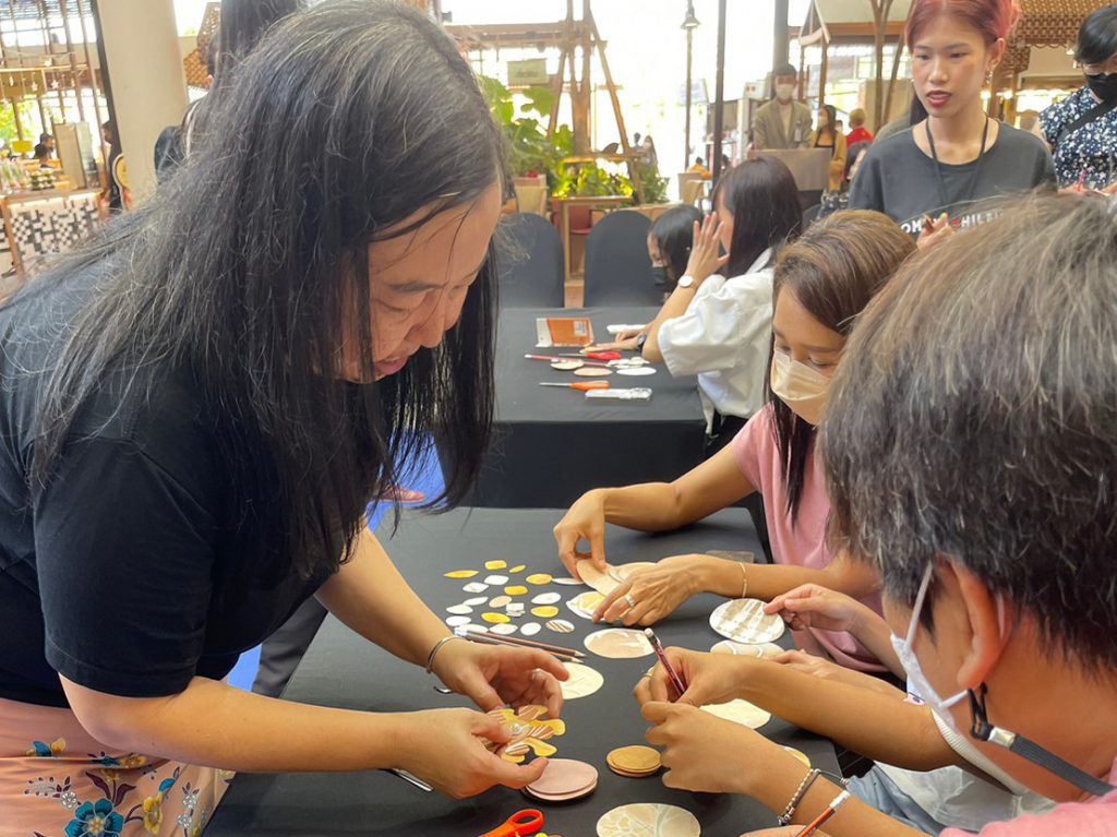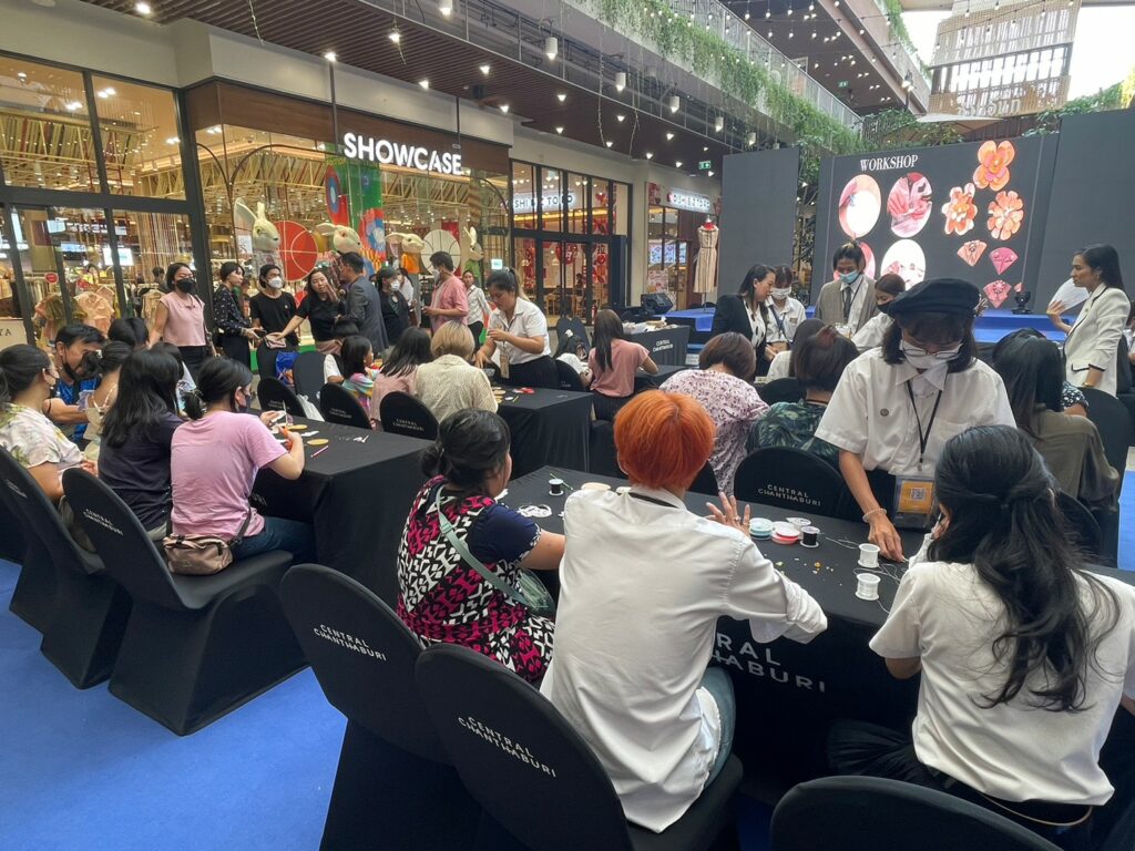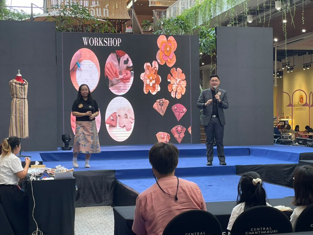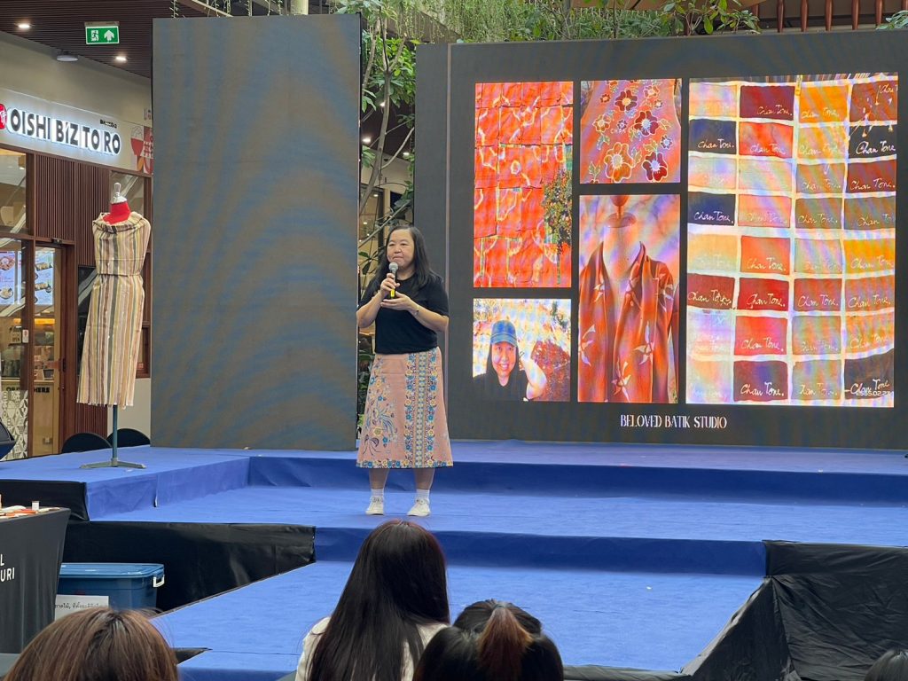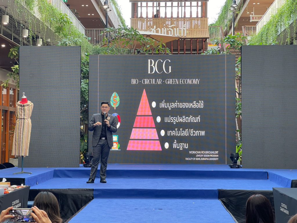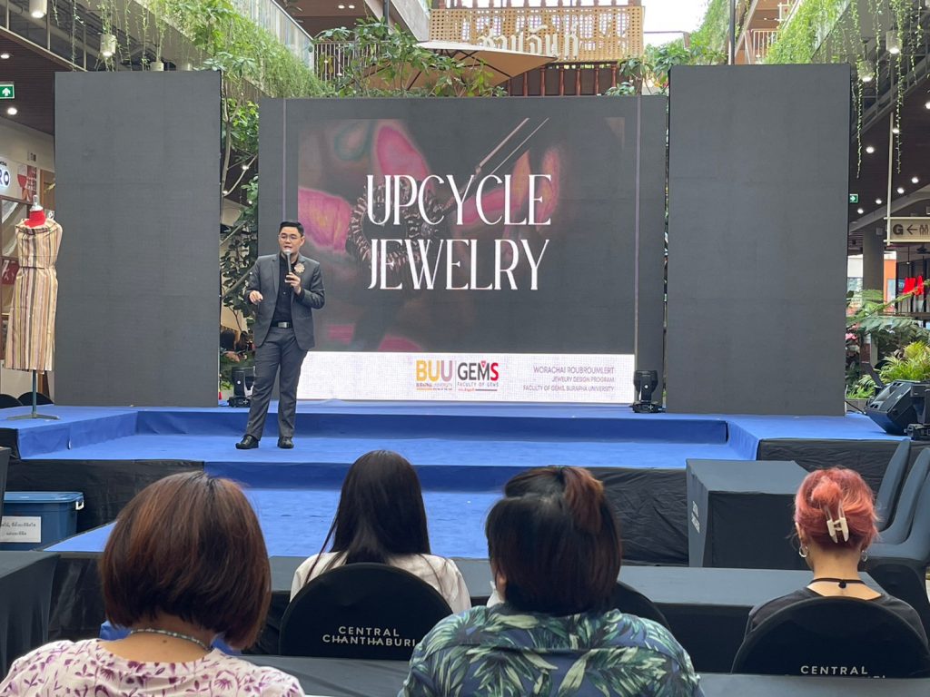 On March 26, the Faculty of Gems held the Gems and Jewelry project exhibition at the Semi Outdoor G floor of Central Chanthaburi. The event featured two distinguished speakers: Asst. Prof. Worachai Roubroumlert, a Jewelry Design lecturer at the Faculty of Gems, and Mrs. Varanuch Suthichannapha, the owner of Beloved Batik Studio. The exhibition included workshops and showcased the upcycled products created by the faculty in collaboration with Mr. Varanuch Suthichannapha. Together, they designed costume jewelry using waste and undervalued materials like sponges, paper clips, plastic bags, bottles, bottle caps, and rags. Furthermore, the batik cloths produced by Beloved Batik Studio are dyed using natural substances such as clay and fruits like mangosteen and mango leaves. These unique cloths, known as “Chan Tone,” reflect their sustainable origins.
