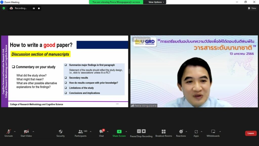 For these reasons, Graduate School, Burapha University recognizes the significance mentioned above. This is aimed at providing support and fostering the knowledge, experience, and research competencies of both faculty members and graduate students. It also serves as a guideline for preparing original research articles for acceptance and publication in international-level journals. Graduate School, Burapha University organized Project to Present the Preparation of the Original Research Article for Acceptance and Publication in an International Journal on Jan 13, 2023 to provide support and enhance the knowledge, experience, and research competencies of faculty members and graduate students and to serve as a guideline for preparing original research articles for acceptance and publication in international-level journals.