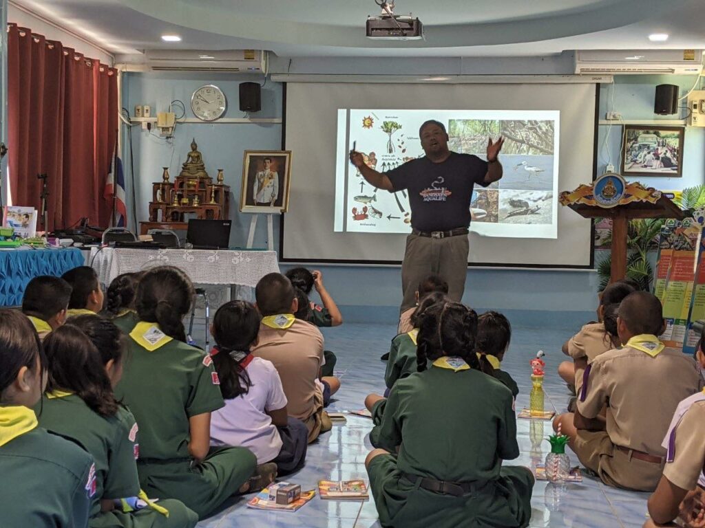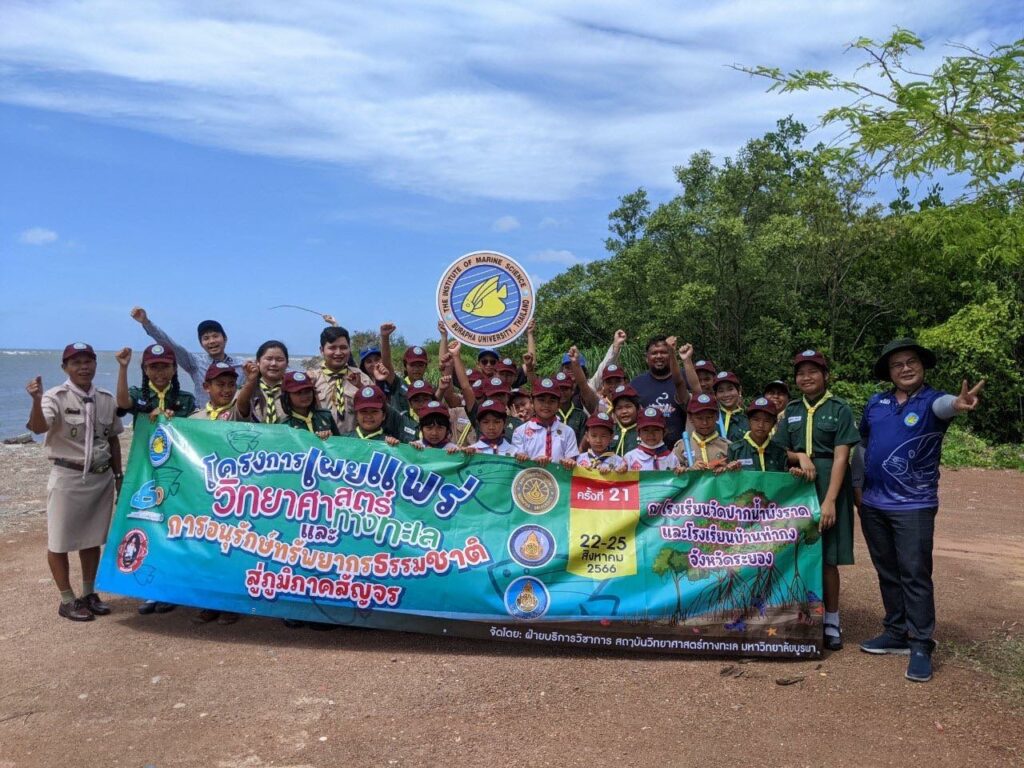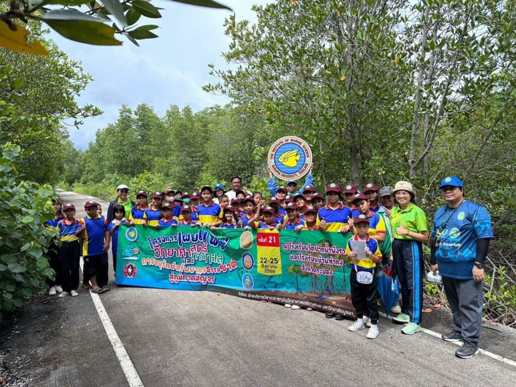 The Institute of Marine Science organized the 21st edition of a project aimed at spreading awareness about marine science and resource conservation in 2023 led by Mr. Jirasak Chaemchuen, Head of the Academic Services Department, with Mr. Techin Pantumongkol, Education Specialist, Mr. Anek Phuthong, Audiovisual Studies Specialist, and Ms. Asan Meenapa, Researcher. The event was organized at two schools in the Eastern Special Development Zone of Rayong Province: Wat Pak Nam Phangrad School and Wat Tha Kong School in Phang Rat Subdistrict in Klaeng District from August 22nd to August 25th, 2023. The project involved 60 primary school students from the Eastern Special Development Zone, Rayong Province.