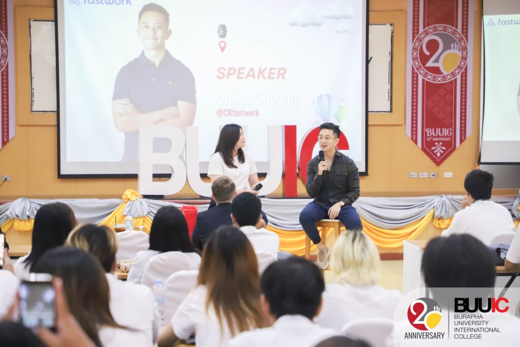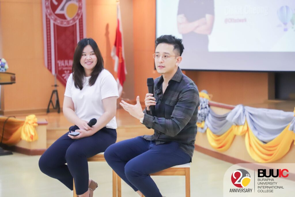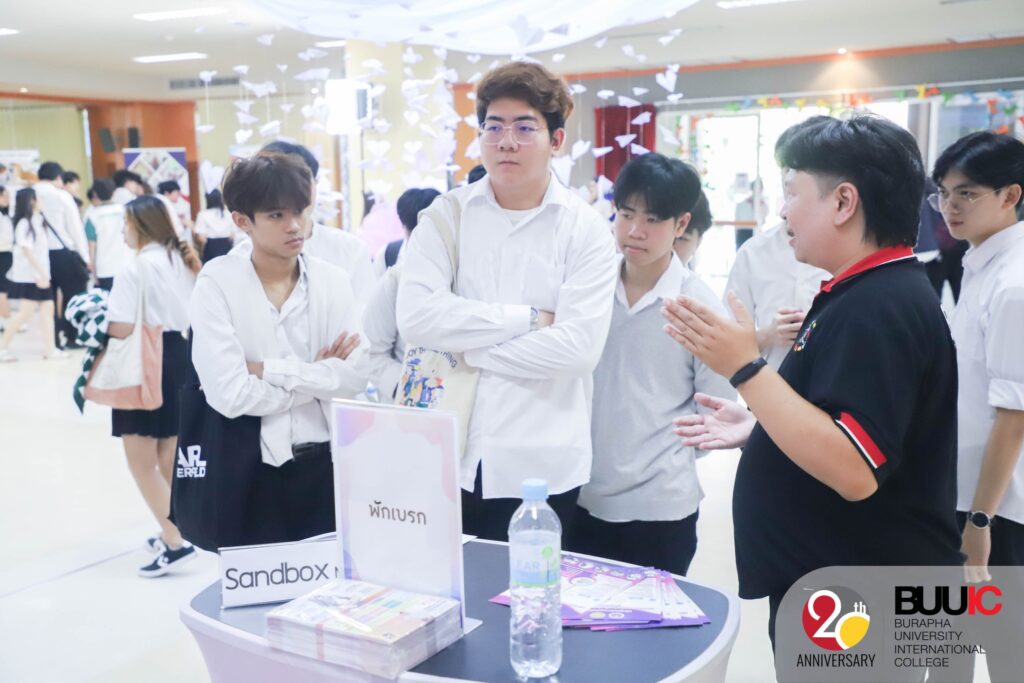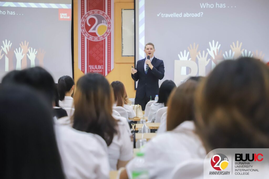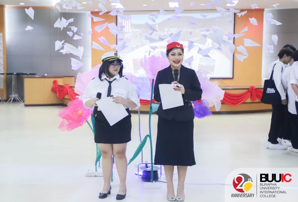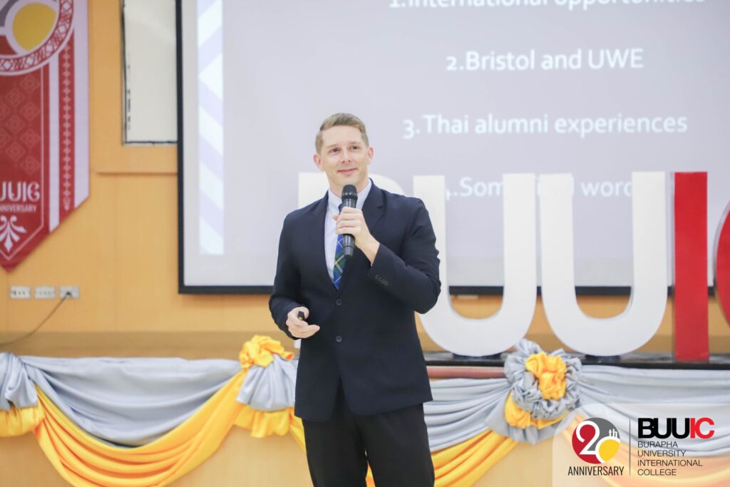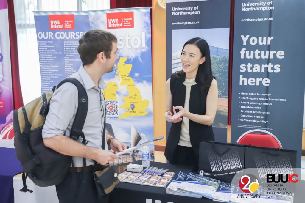 To ensure inclusive and equitable education, Burapha University International College (BUUIC) held the event titled ‘BUUIC Study Abroad Fair 2023’ on Wednesday, 8 November 2023. In the morning, the event featured guest speakers Mr. Zach MacDonald (Representative from the University of the West of England or UWE, UK) and Mr. Chikit Chen, CEO of Fastwork and famous influencer in Thailand. Mr. MacDonald and Mr. Cheong shared their international/intercultural experiences living and working in different parts of the world, as well as valuable suggestions about building passion. This particular sharing session helped build a lifelong learning journey for the students who joined the session. In the afternoon, there was an international education booth exhibition. Each booth represented BUU and BUUIC international partners from around the world. Though they were from different institutions and countries, they shared the same goals, which were to foster affordable quality education as well as to offer partial and full scholarships. No student should be in debt or feel economically challenged to earn a quality education. Besides, students actively and collaboratively joined the cultural games at the exhibition and earned rewards, including notes designed as boarding passes and homemade ice cream.