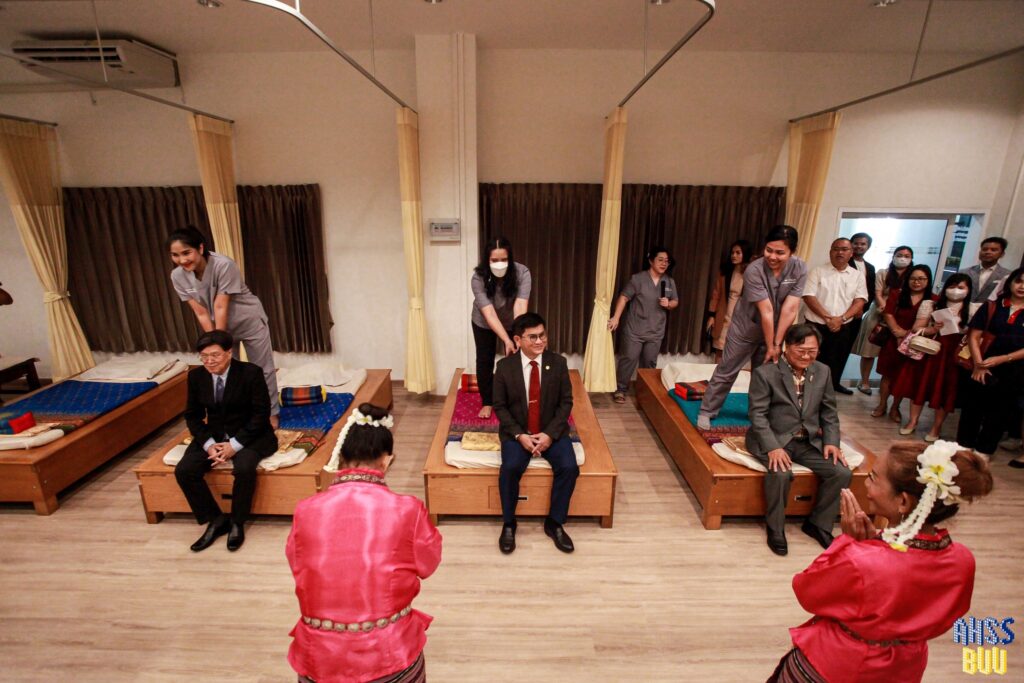 Additionally, the Faculty of Allied Health Sciences renovated the first-floor room of the Medical Science Building to become the Thai Traditional and Alternative Medicine Service Center (Thai Traditional Medicine Clinic) on November 10, 2023. Burapha University then held the grand opening ceremony of the comprehensive health service center of the Faculty of Allied Health Sciences (AHS-Wellness Hub), graced by Associate Professor Dr. Sumon Sakonchai, President of Burapha University Council, Assoc. Prof. Watcharin Gasaluck, Ph.D., President of Burapha University, and Assoc. Prof. Somtawin Jaritkhuan, Ph.D., Vice President for Academic Affairs, who presided over the ceremony. Many distinguished guests from both within and outside Burapha University attended the event.