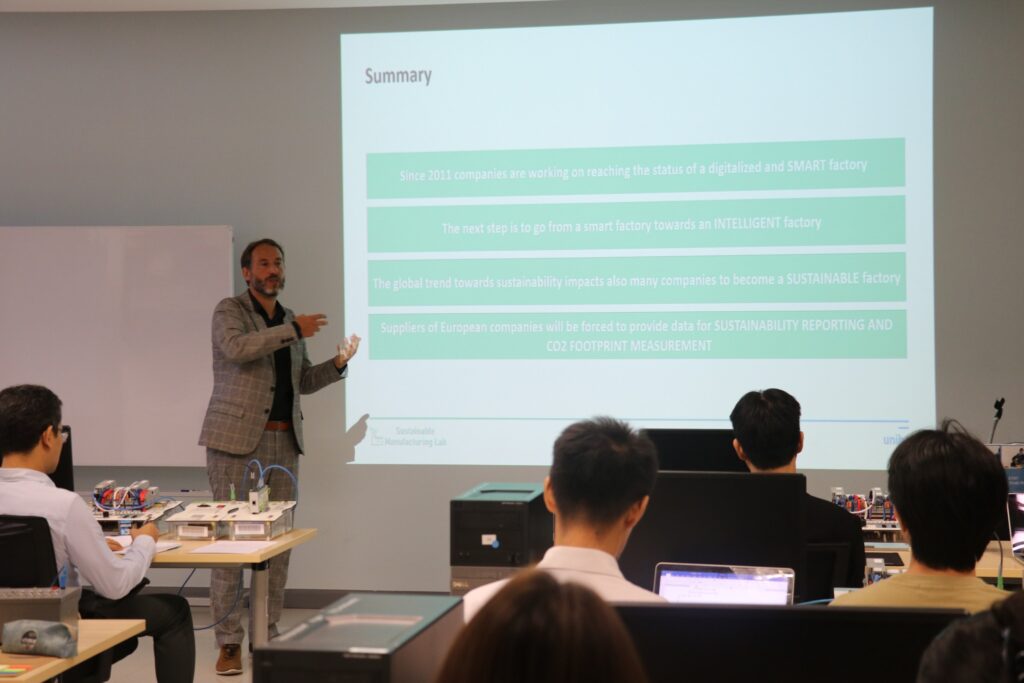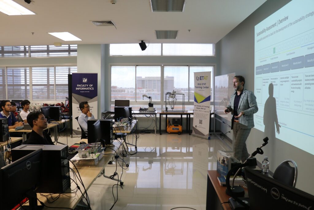 On Tuesday, August 27, 2024, at 1:00 PM, on the 7th floor of the Faculty of Informatics Building, the Digital Media and Interaction (DMI) Laboratory and the BUU ETAT Training Center hosted a lecture and workshop by Prof. Dr. Ing. Erwin Rauch. Prof. Rauch, an expert in sustainable and environmentally friendly production systems for small and medium-sized industries, is from the Free University of Bozen-Bolzano, Italy. The topic of the lecture and workshop was “Trends towards Smart and Sustainable Manufacturing.” The event provided insights into Industry 5.0 technologies and included a workshop for participants. The purpose of this activity was to offer guidance to faculty members and students of the Faculty of Informatics, enabling them to apply the knowledge gained to teaching and research. Additionally, there were discussions on potential collaborations and the strengthening of relationships between Burapha University and Universities in the Asia and Europe regions for sustainable research and development in the future.