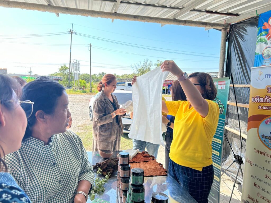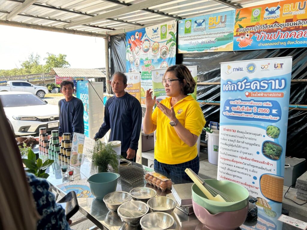 In addition to these community activities, the project also provided knowledge and hands-on activities, such as a demonstration on how to make Chakram cake, made from Chakram, a beneficial mangrove herb, as well as fabric dyeing using mangrove plants. There was also a presentation on using natural materials like bamboo, which are waste products from mussel farming, to make various utensils, promoting the reduction of plastic use and environmental friendliness. These activities aim to support sustainable local occupations and businesses for the community.