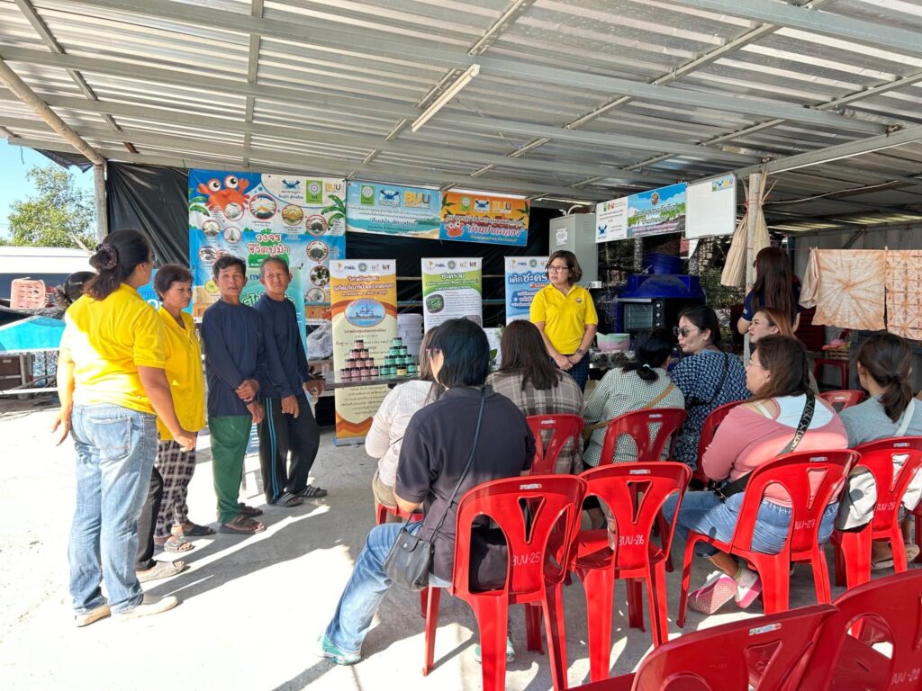 The event aimed to allow members of the “Kaoyot” Small Fishing Boat Community Enterprise Blue Swimming Crab Bank, led by Ms. Duangkamol Romruen, the bank’s president, to exchange knowledge on product improvement and marketing with the Ban Pak Khlong Community Enterprise. The discussion was joined by Mr. Saroj Suparat, president of the Ban Pak Khlong Blue Swimming Crab Bank, Ms. Jiraporn Phlanan, president of the community enterprise, and Ms. Pornpimon Phlanan, the vice president and secretary, who shared knowledge and insights with the local community on sustainable fisheries management and aquaculture.
