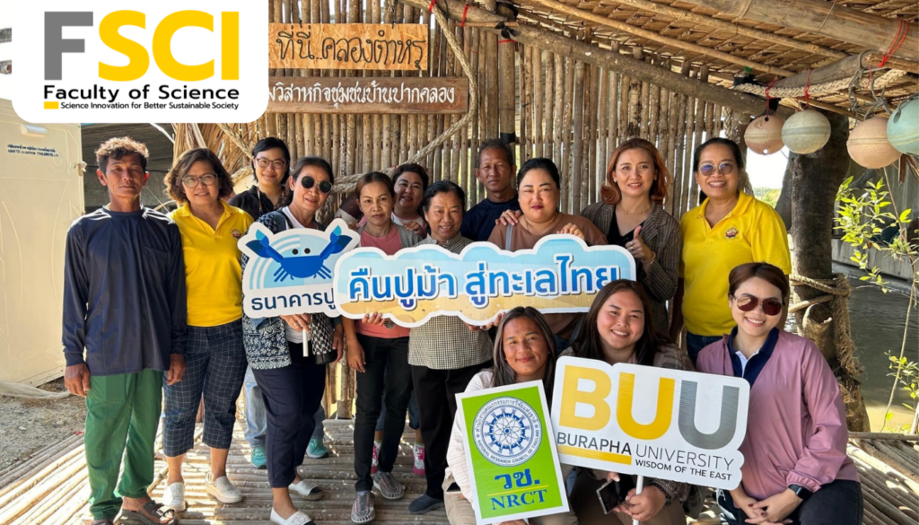 The Blue Swimming Crab Bank Project has been continuously conducted by the Faculty of Science at Burapha University. The project aims to provide the fishing community with accurate knowledge about blue swimming crabs and encourage other fishing communities to participate in aquatic animal conservation to increase the crab population in natural habitats. It also promotes sustainable activities related to blue swimming crabs. On December 18, 2023, the Faculty of Science, led by Associate Professor Dr. Jariyawadee Suriyaphan and Dr. Patcharee Thong-ampai, along with researchers from the Blue Swimming Crab Bank Expansion Project in collaboration with the National Research Council of Thailand (NRCT), organized a study tour of a model blue swimming crab bank to share lessons for the sustainable development of crab bank activities at the Blue Swimming Crab Conservation Bank, a community enterprise called “Ban Pak Khlong” in Chonburi province.