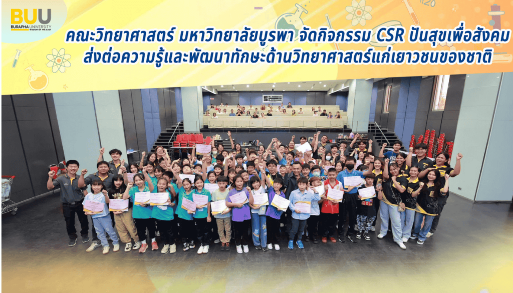 The Faculty of Science, Burapha University, has joined in responding to the royal initiative of Her Royal Highness Princess Maha Chakri Sirindhorn by collaborating with the National Science and Technology Development Agency (NSTDA) and the Institute for the Promotion of Teaching Science and Technology (IPST) to organize a CSR activity titled “Sharing Happiness for Society.” This initiative aims to transfer knowledge and enhance science-related skills among Thai youth, as part of the “Thailand Children’s University Project.”
